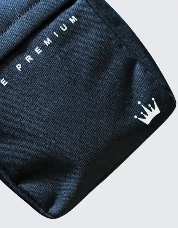 Pure PremiumMedium black crossbody bag from Pure Premium which is made from a durable textured fabric and features a main zip compartment, a front zip pocket, and white logo/crown details.