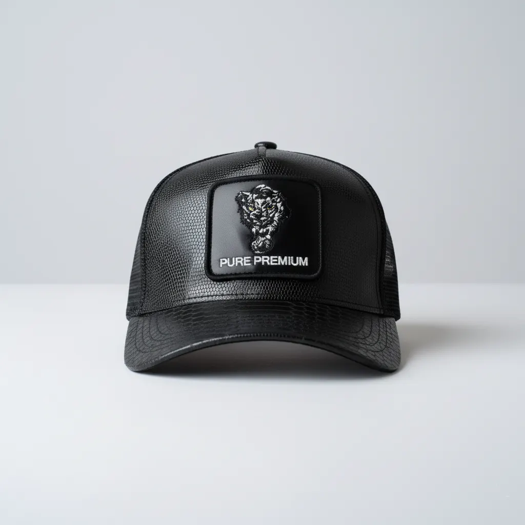 Pure PremiumBlack trucker-style cap from Pure Premium. This cap features a snakeskin-textured front, mesh back panels, and a square patch with an embroidered panther and logo.