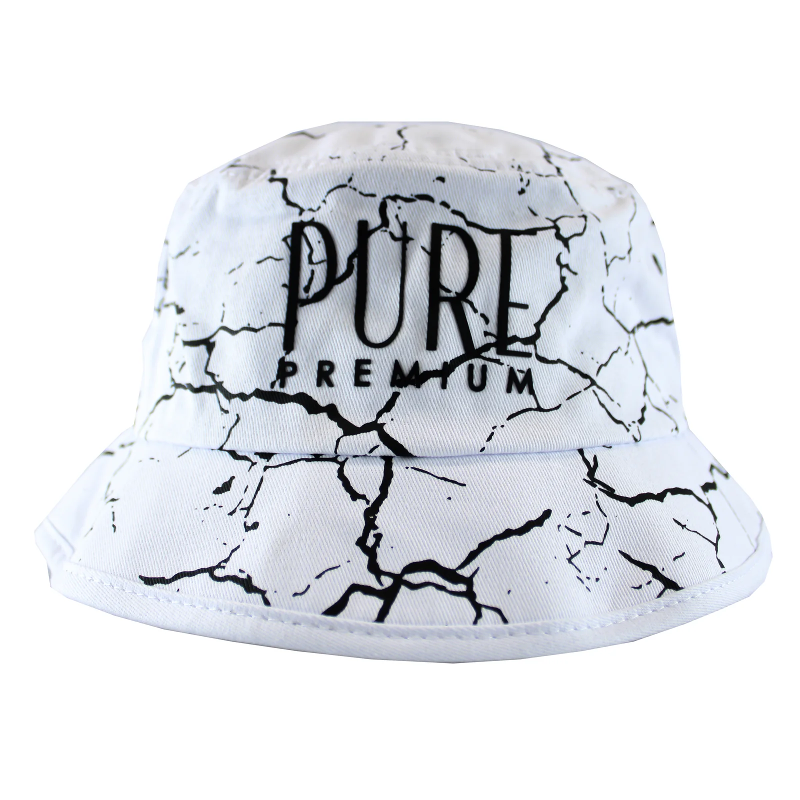 Pure PremiumWhite bucket hat from Pure Premiumwith an all-over black marble/crackle print and a large “PURE PREMIUM” logo printed on the front.