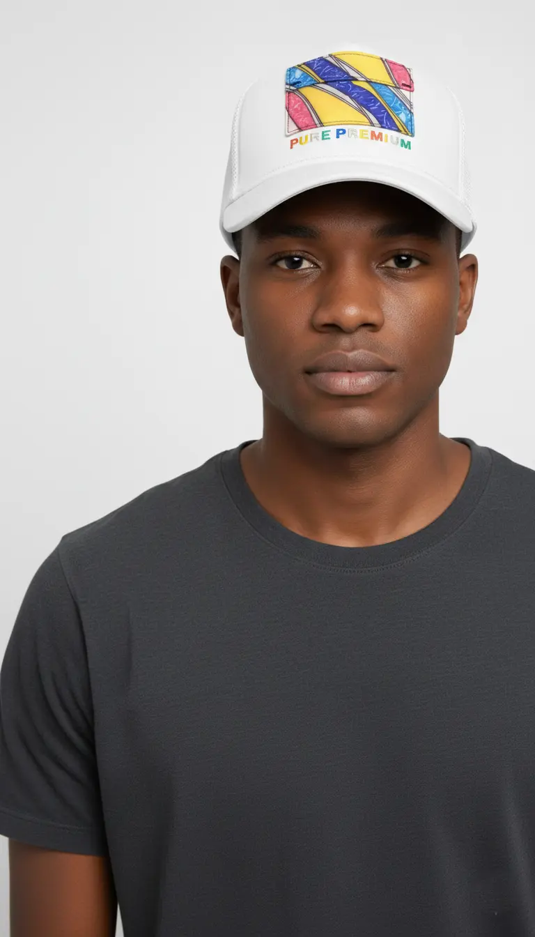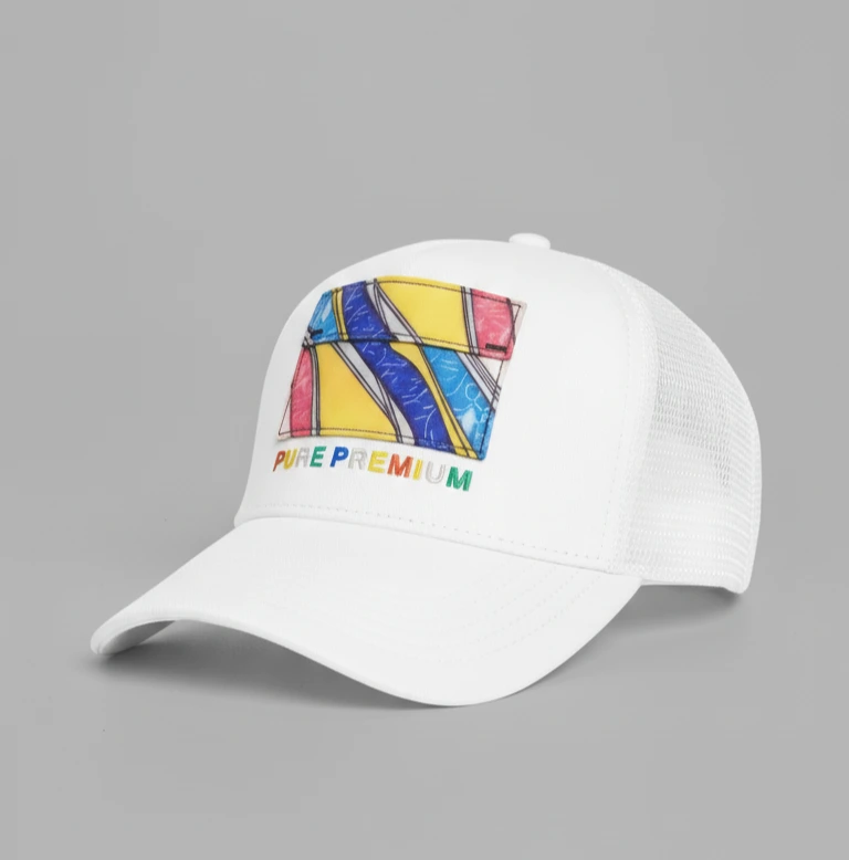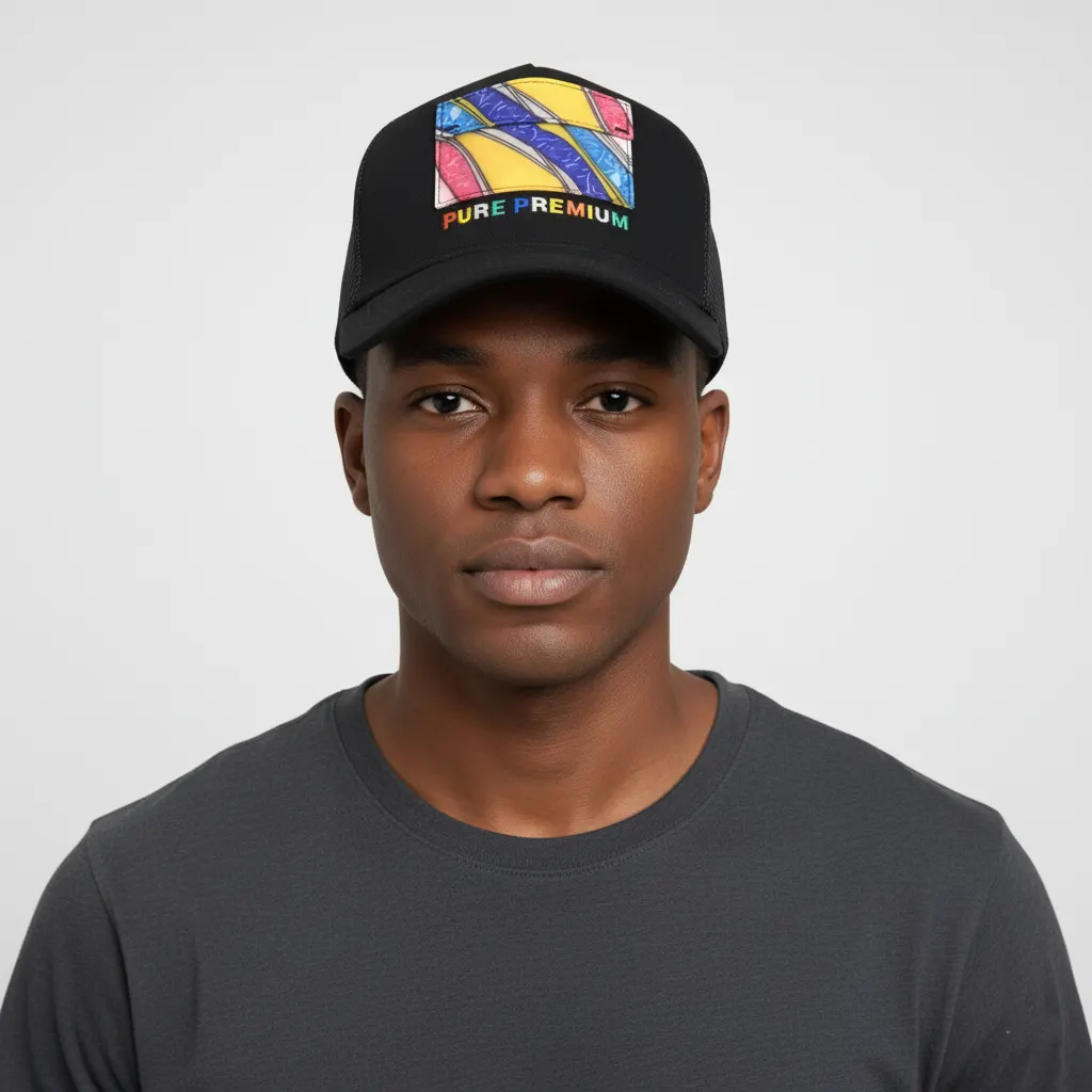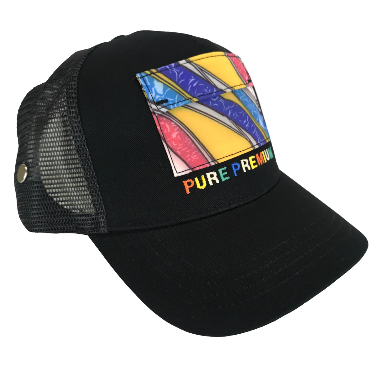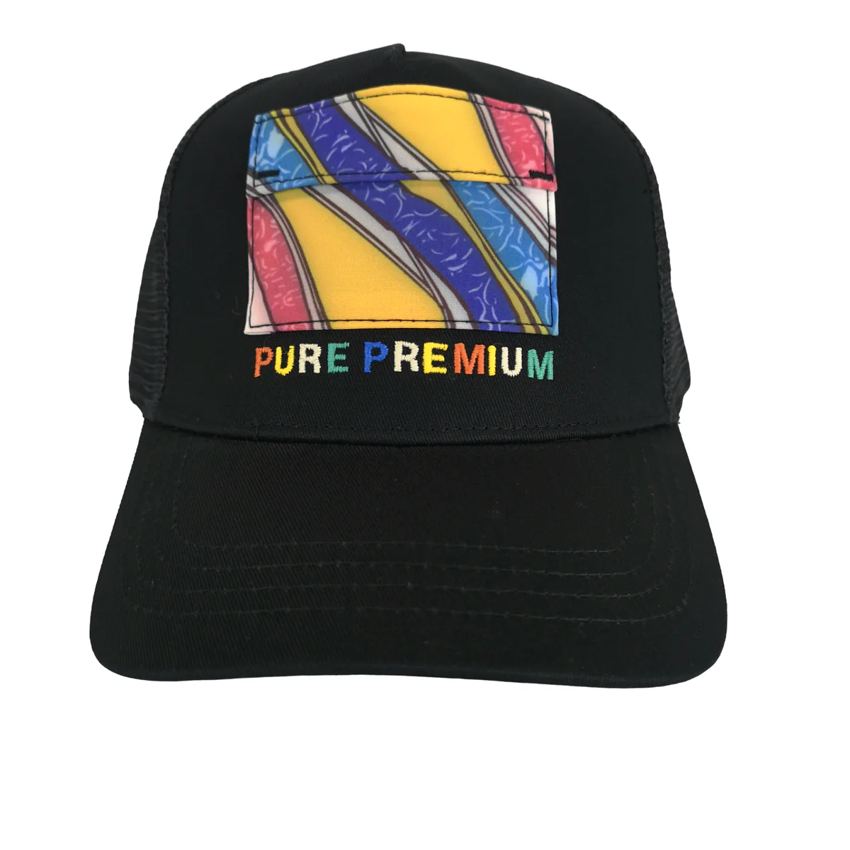Pure PremiumCap from Pure Premium, available in black or white. The cap has a colourful patterned patch on the front, multicoloured “PURE PREMIUM” embroidery, and a breathable mesh back.