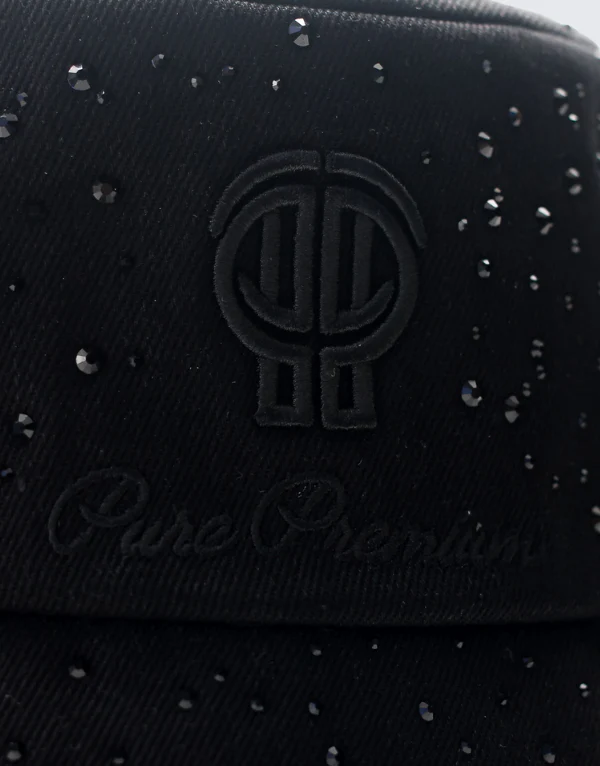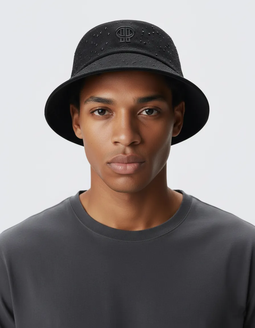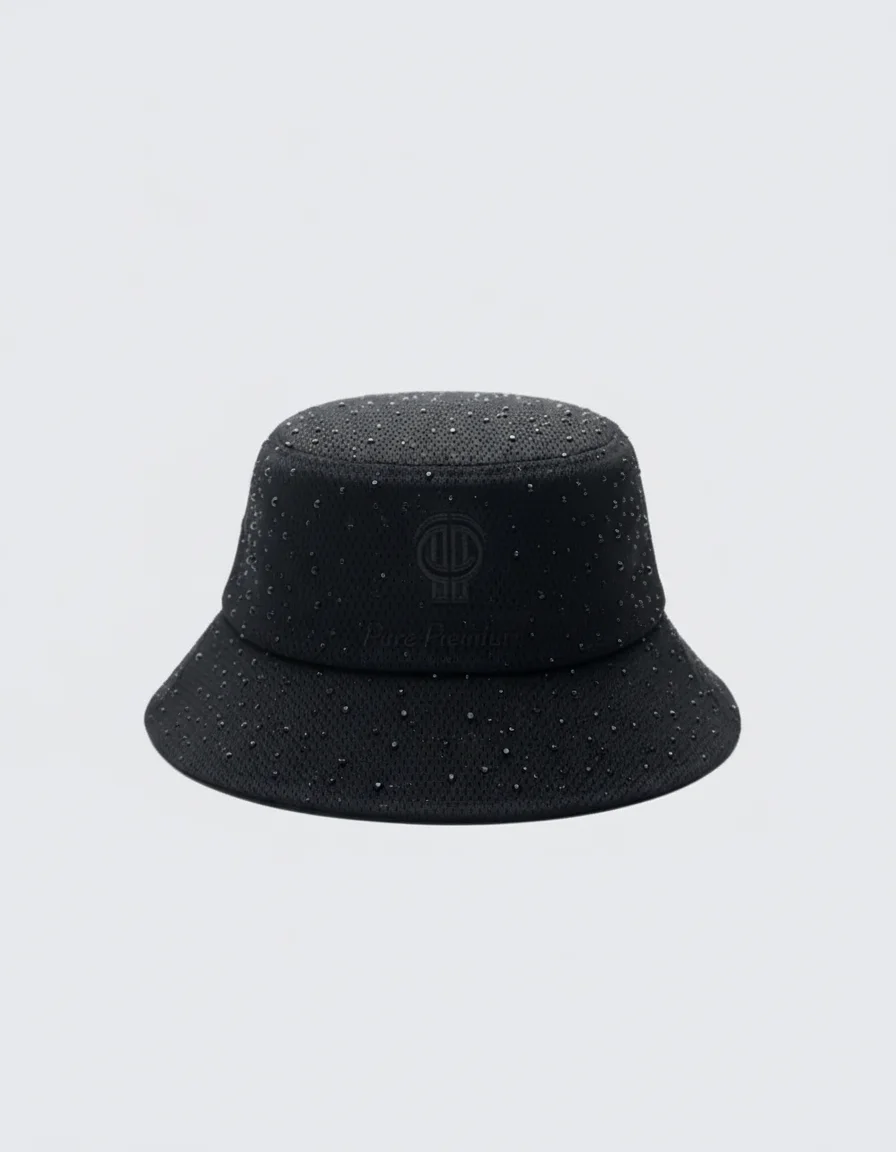 Pure PremiumClassic black bucket hat from Pure Premium. This hat has a black logo embroidery on the front and is decorated with small, scattered black crystal beads.