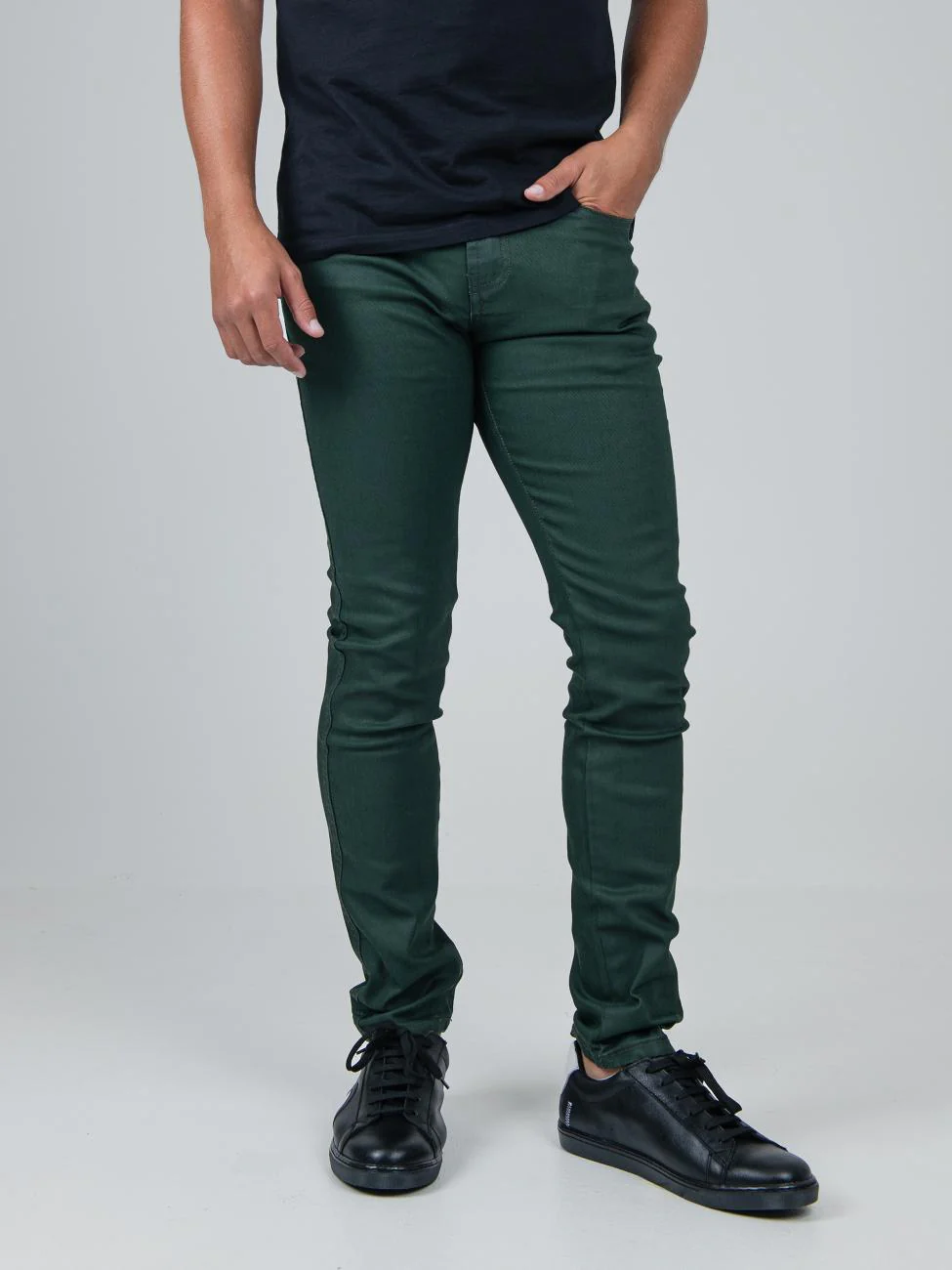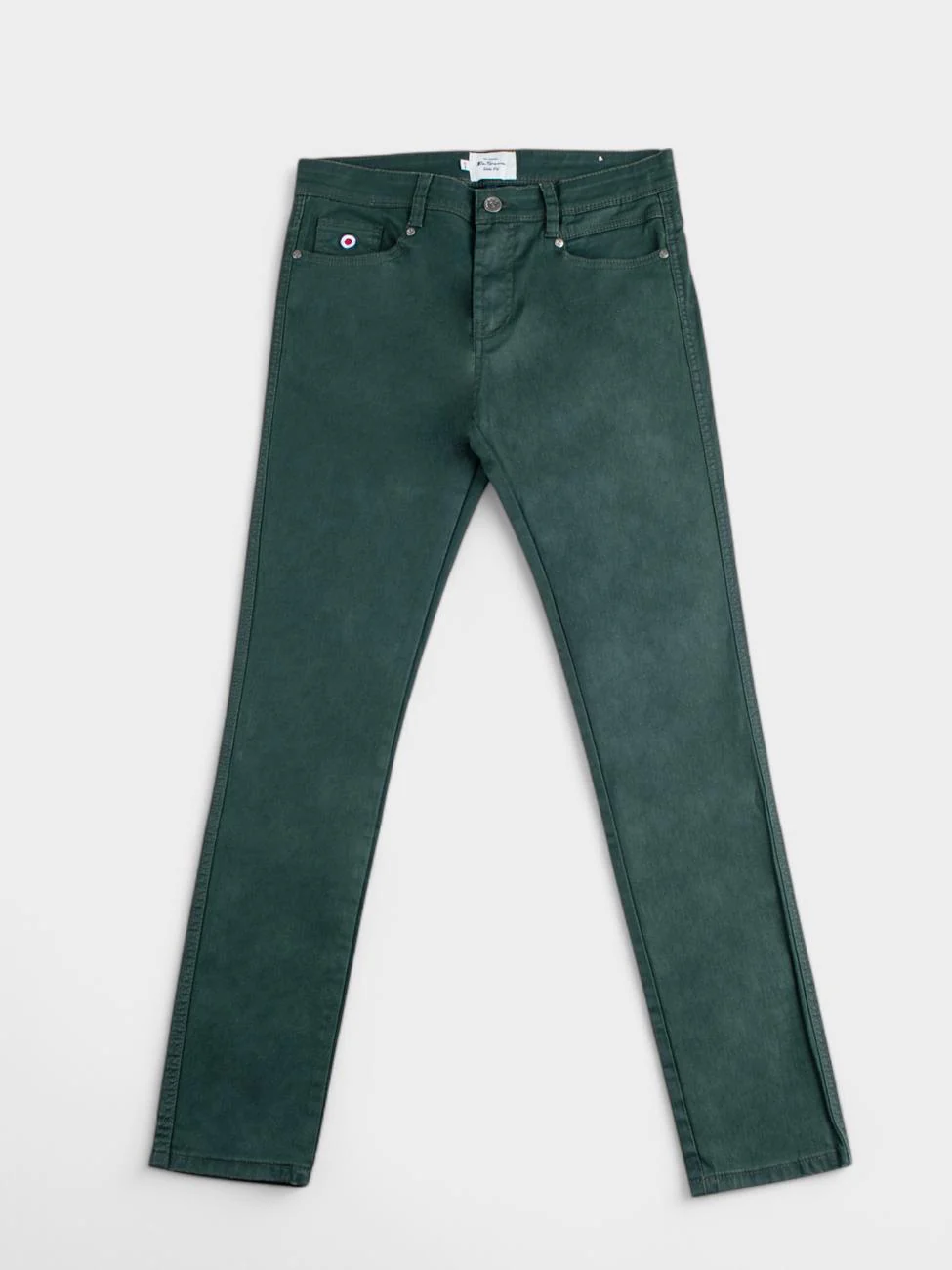 Ben ShermanArmy green denim jeans with a wax coated finish. Get a modern, leather-like look on comfortable denim fabric with classic 5-pocket styling.