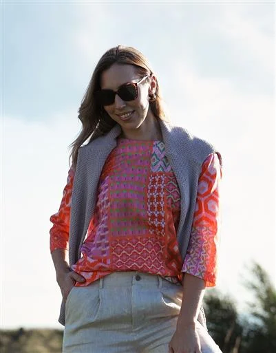 Spanish cotton top with a colourful geometric print. You get a relaxed, loose fit with loose ¾ sleeves.