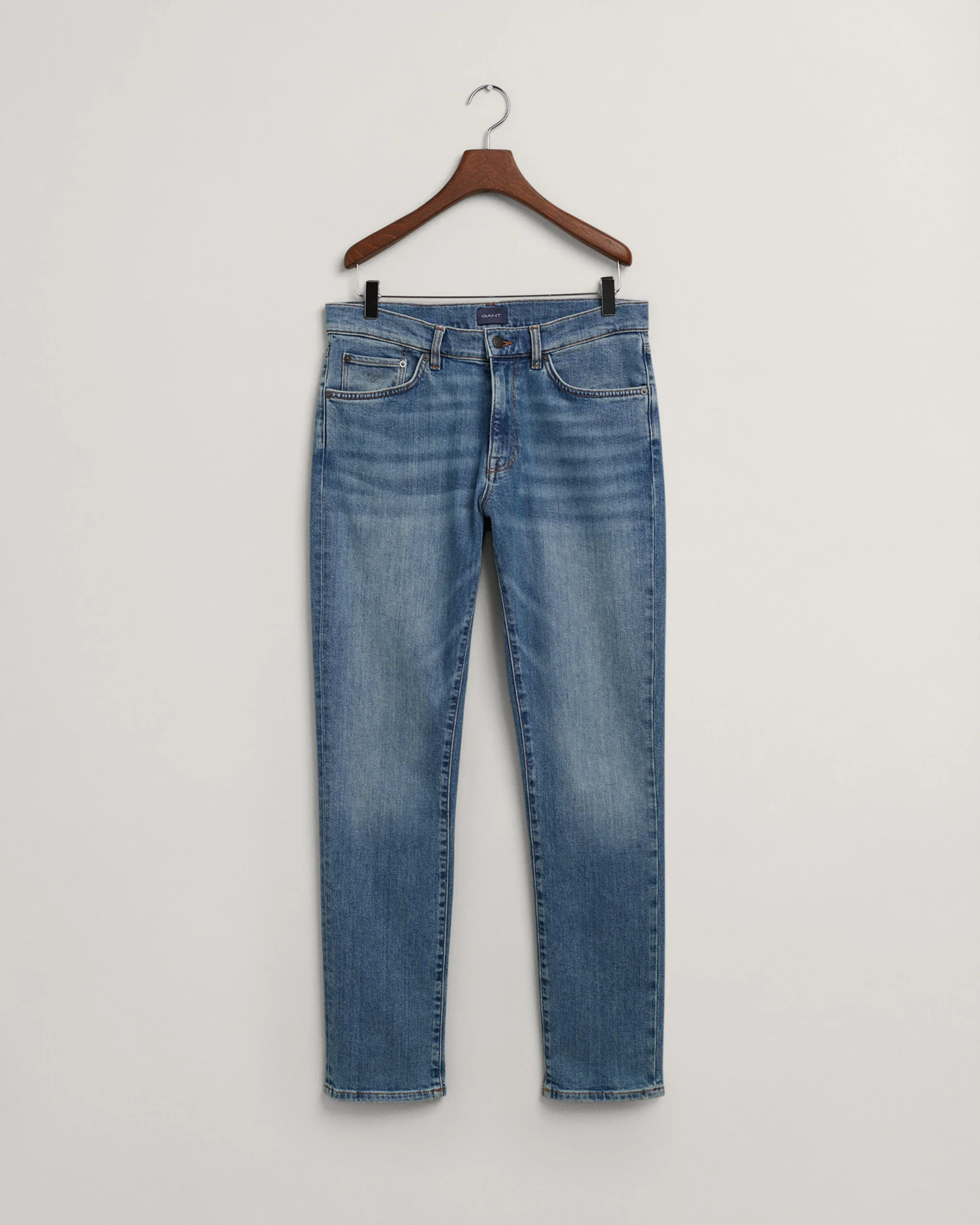 GantMid-blue slim-fit jeans made from 97% cotton, 2% polyester, and 1% elastane. Features a mid-rise waist, slim leg, and a comfortable worn-in wash.