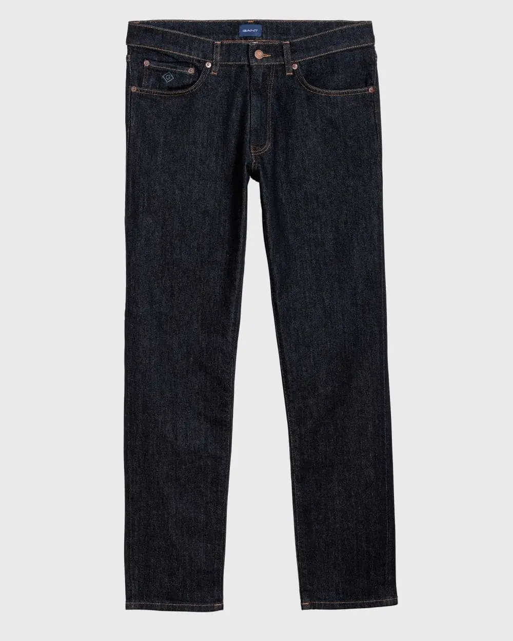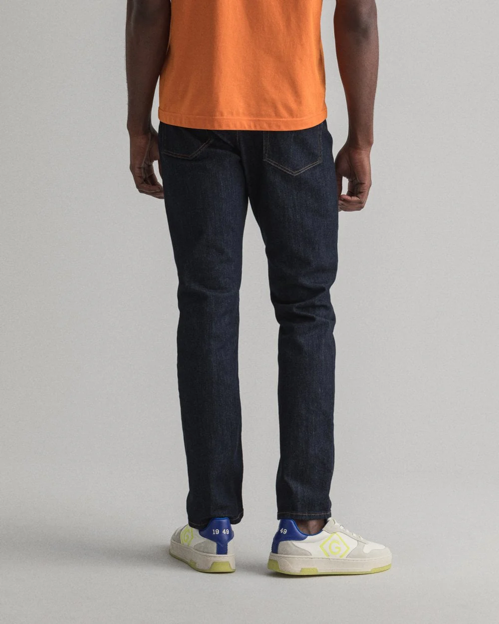 GantGant Dark blue slim-fit jeans made from 97% cotton, 2% polyester, and 1% elastane. It has a mid-rise waist, straight leg, and classic five-pocket design.