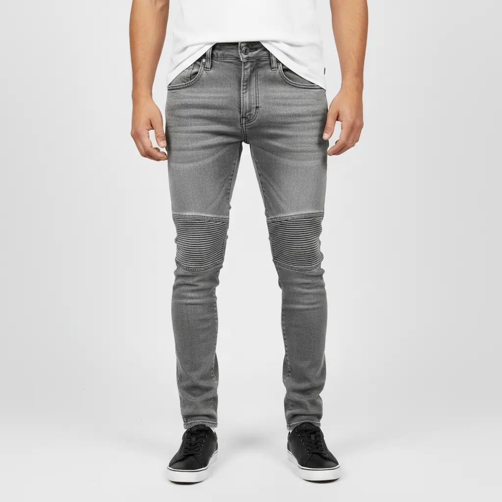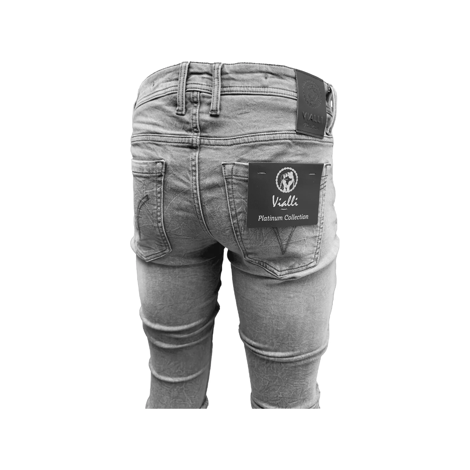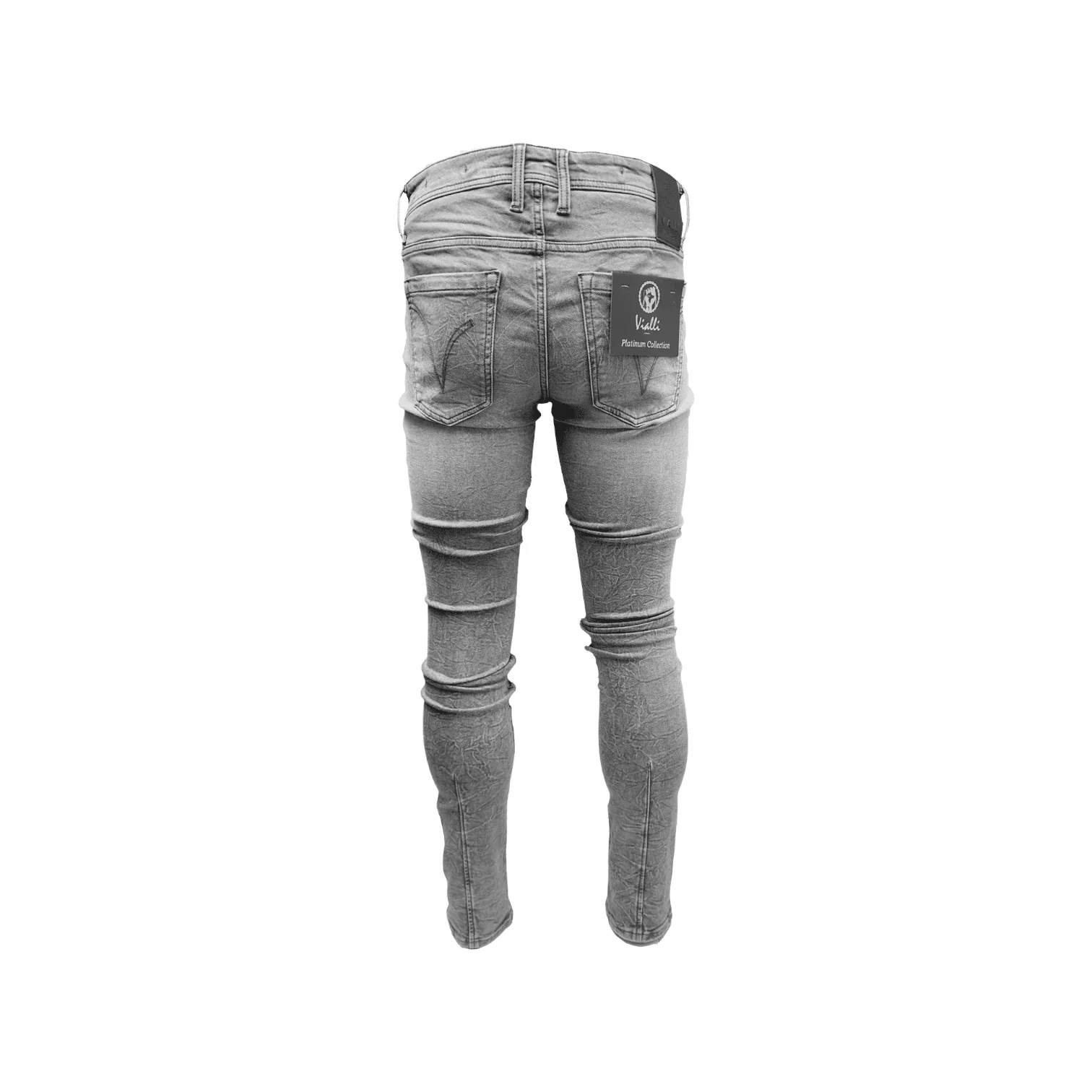 VialliMen’s light grey, skinny-fit denim jeans with highly textured, patterned paneling on the knees and lower legs for a bold, modern look.