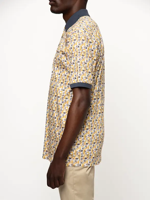 Yellow double mercerised golfer with a bold abstract print and solid contrast details.