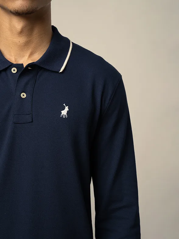 PoloPolo Men’s Essential Pique LS Golfer in navy. Cotton pique shirt with contrast tipping on the collar and cuffs.