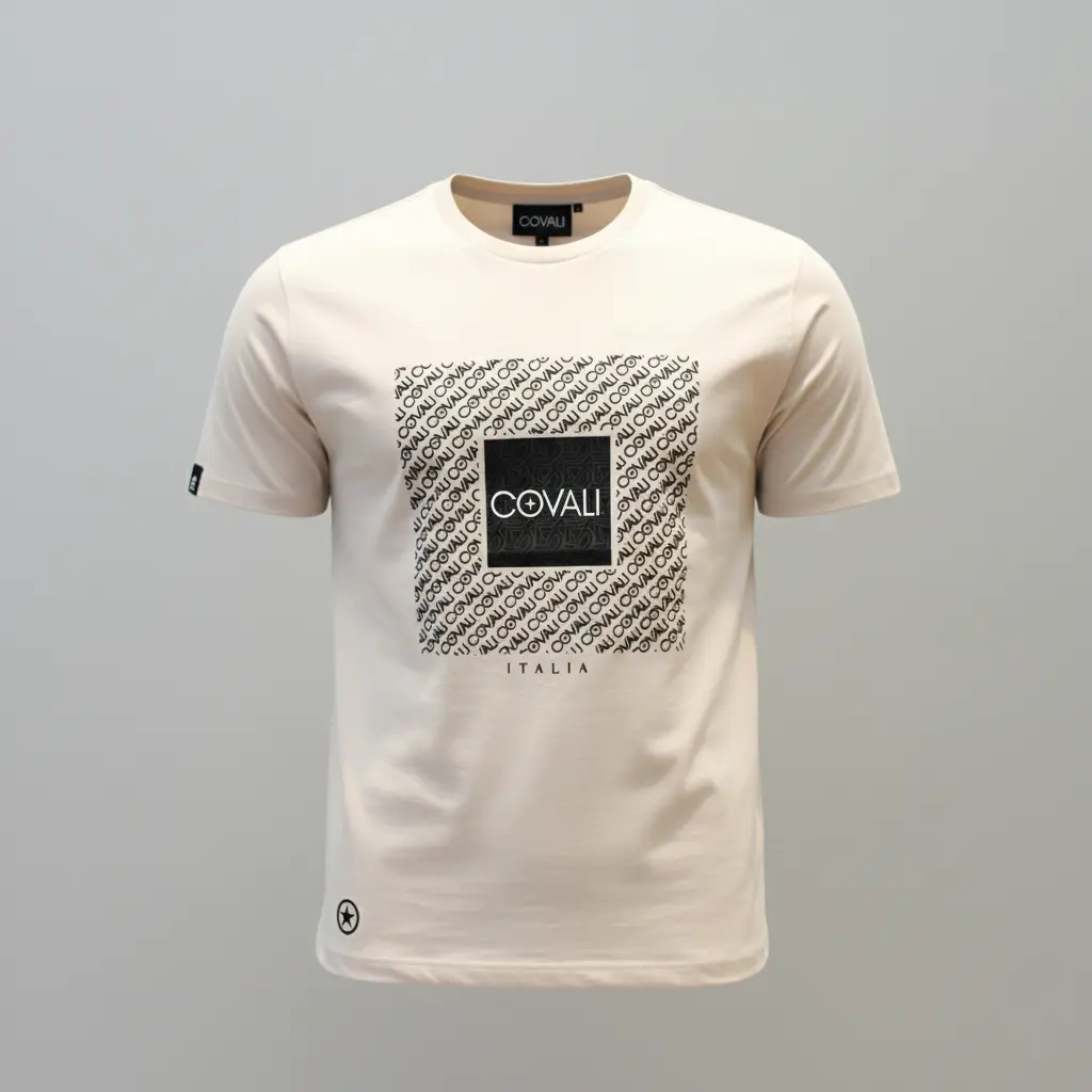 CovaliMen’s beige T-shirt with a signature metallic chest badge. Premium cotton-blend and regular fit.