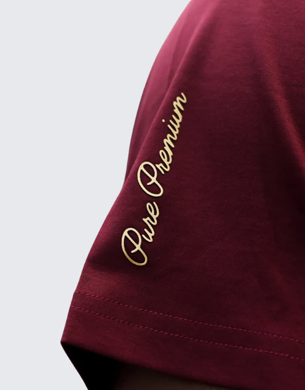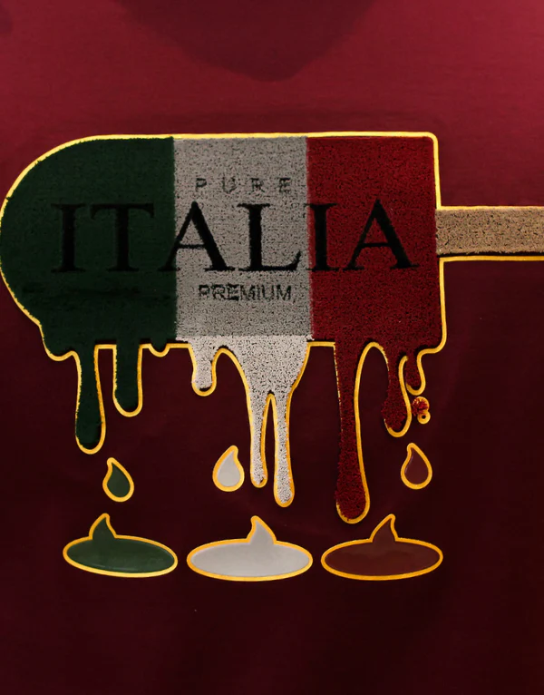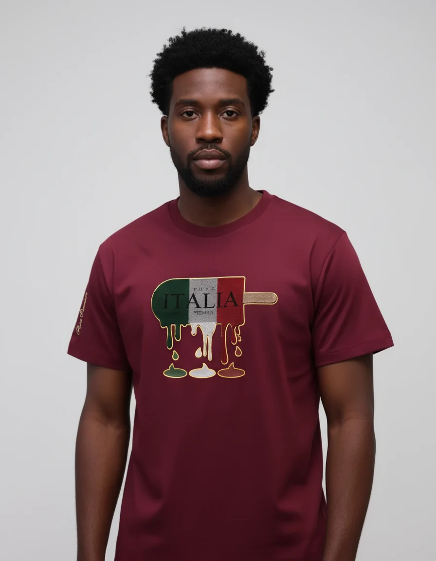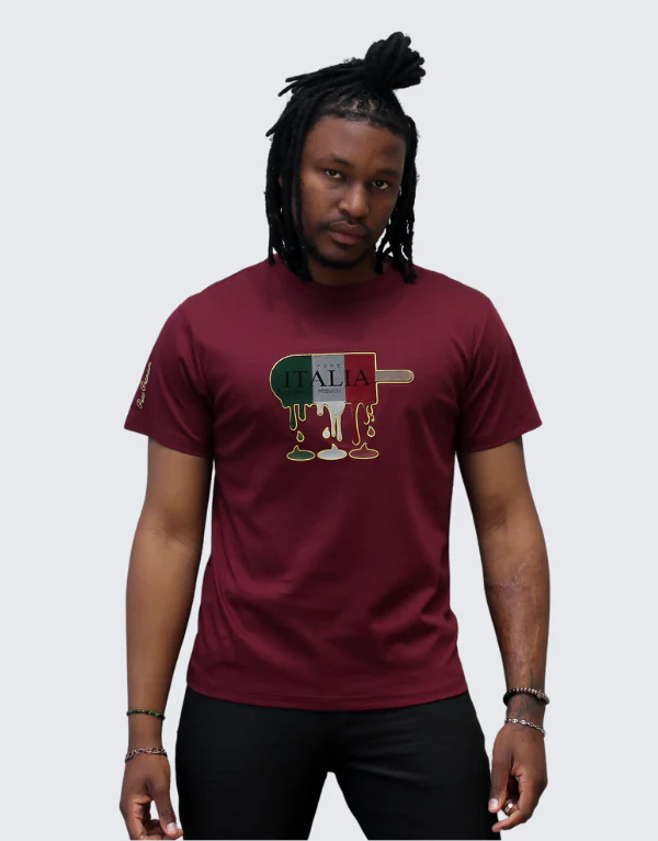 Pure PremiumA burgundy men’s t-shirt from Pure Premium. This crew neck shirt has a large chest graphic of a melting Italian flag ice lolly and a gold script logo on the sleeve.