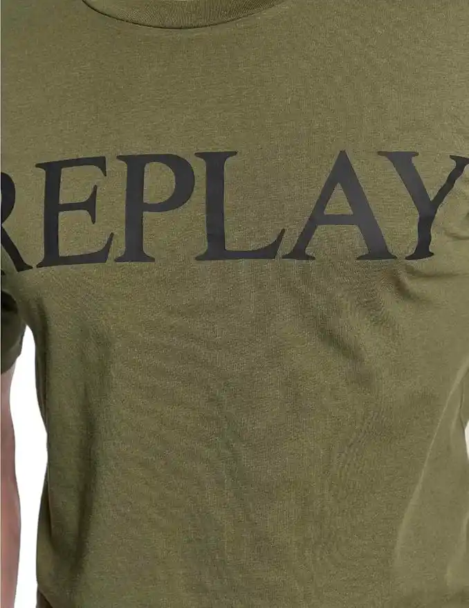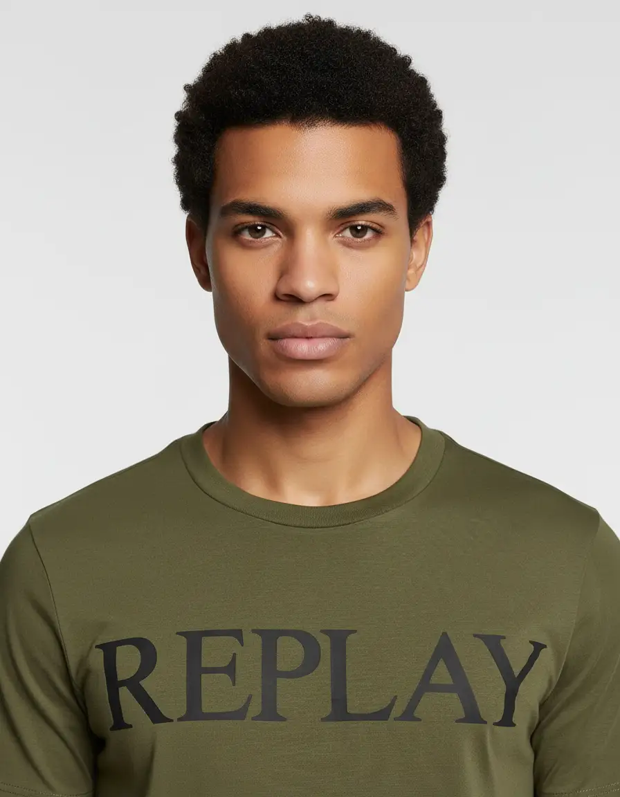 ReplayMen’s regular-fit crew-neck T-shirt in olive green. Made from 100% cotton, with a large “REPLAY” logo print on the chest.
