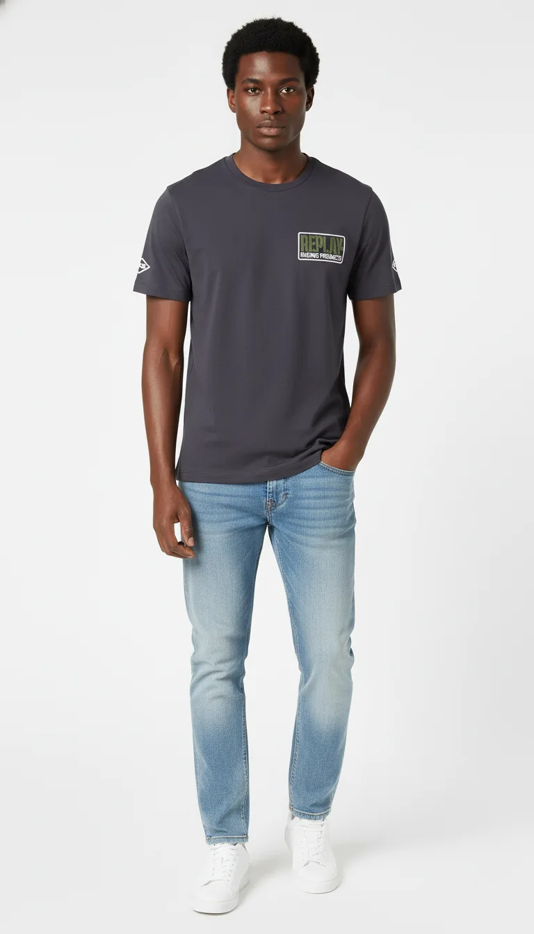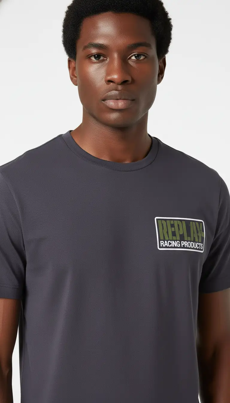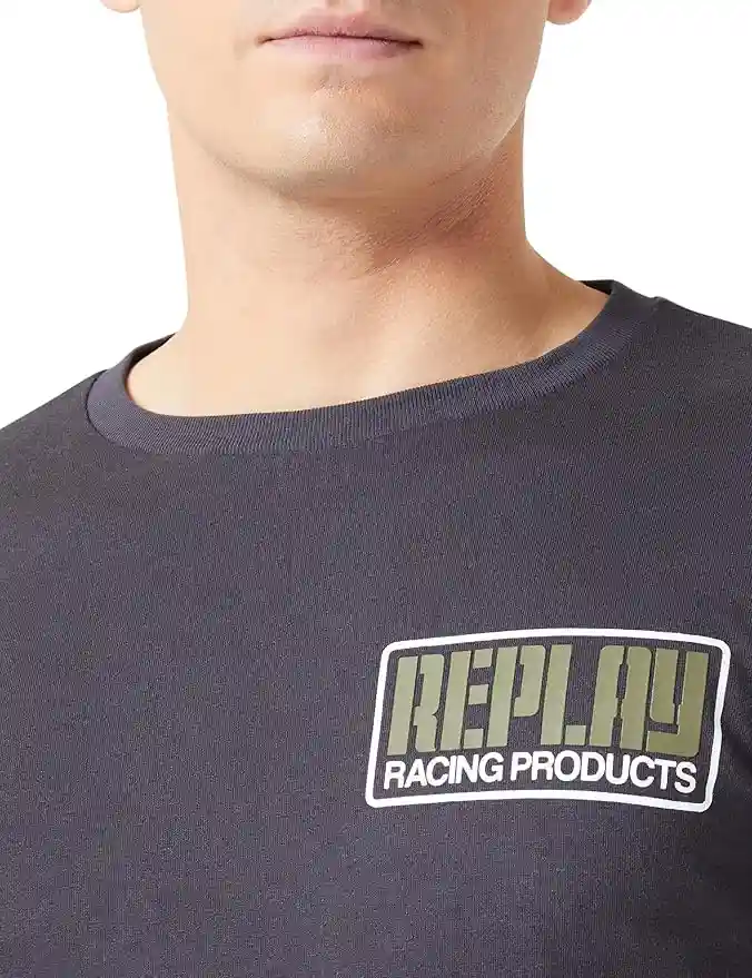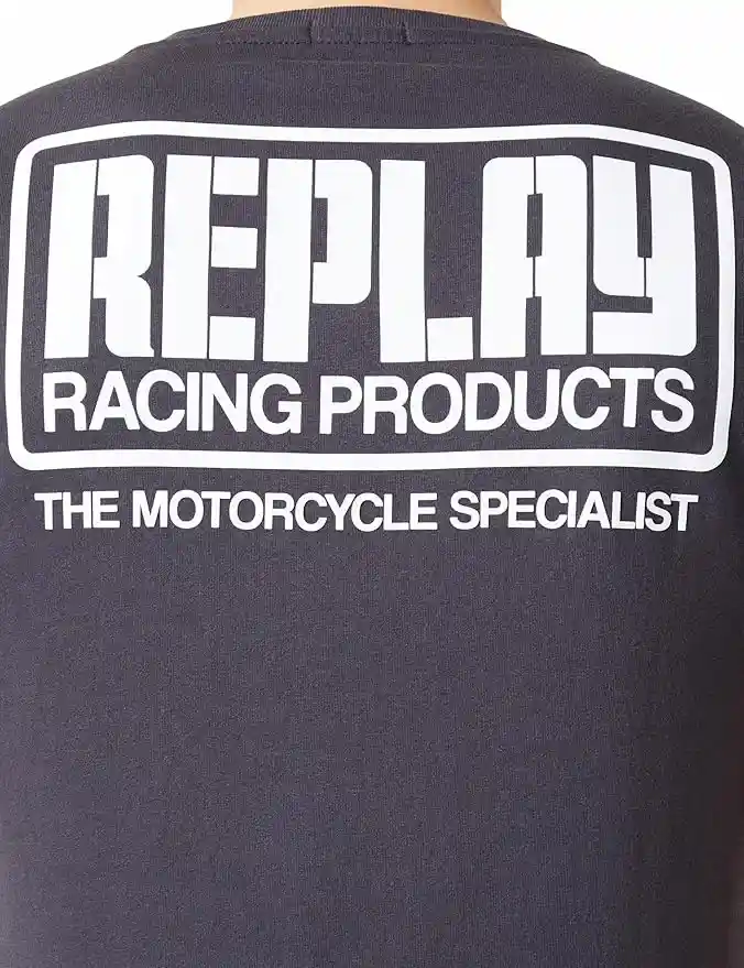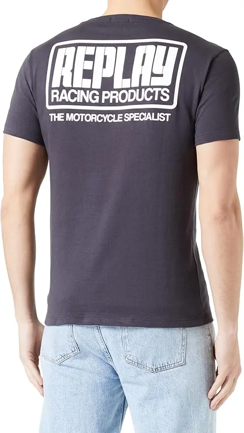 ReplayReplay Racing T-shirt, a men’s regular-fit crew-neck in “Nearly Black”. Made from 100% cotton, it features “Racing Products” graphics on the chest and back.
