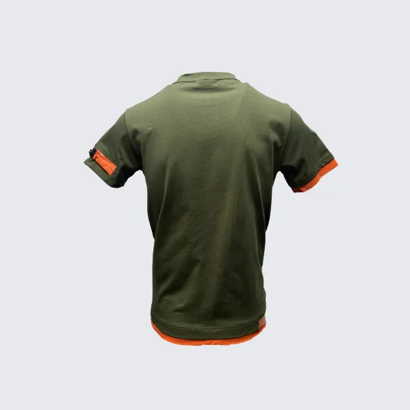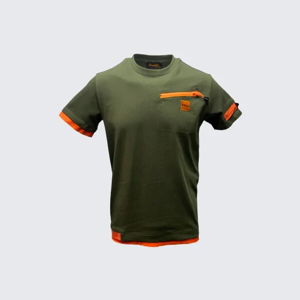 VialliOlive green men’s crew-neck t-shirt with short sleeves. Features neon orange trim, a zipped chest pocket, and a second zip pocket on the sleeve for functional detail.