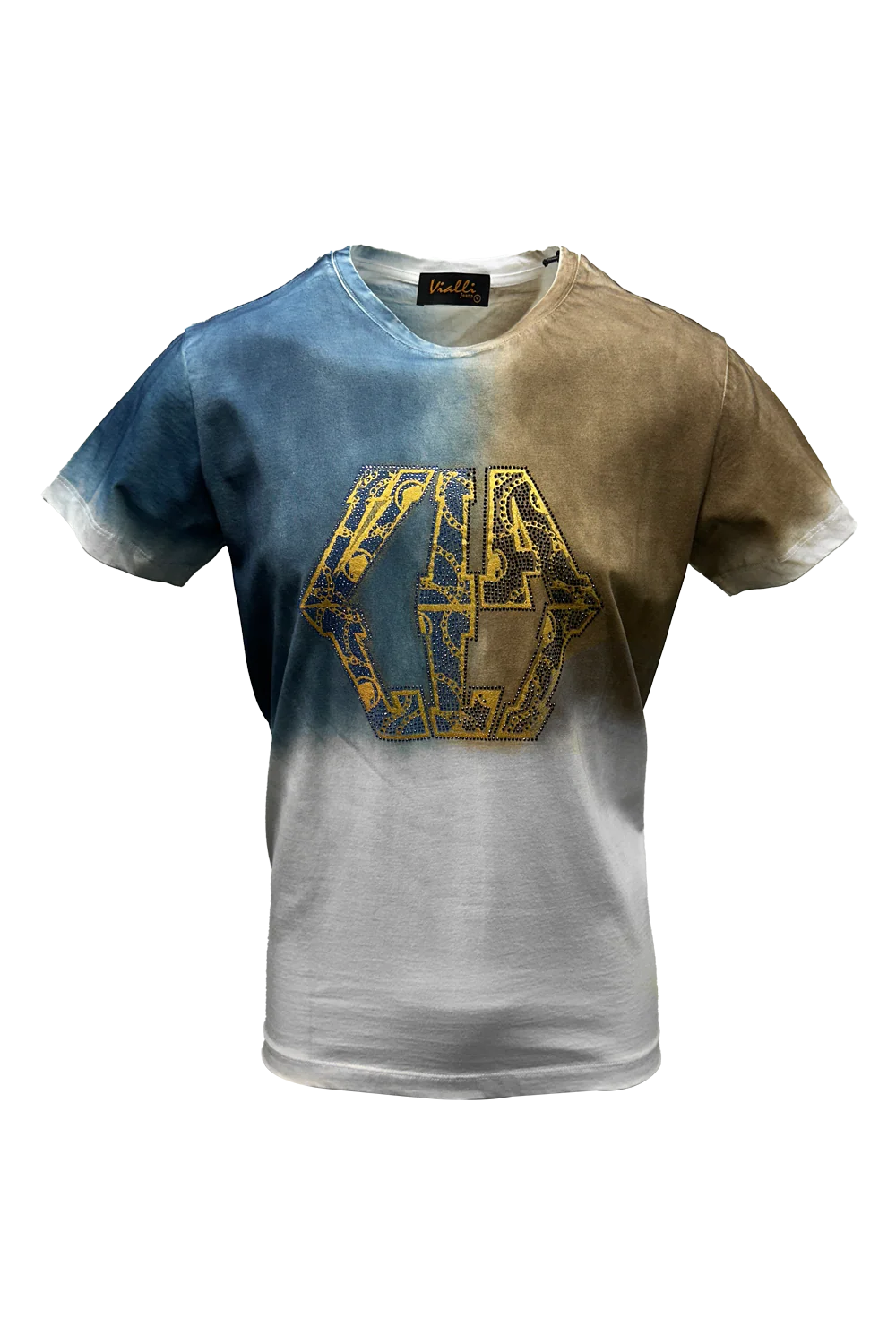 VialliA men’s T-shirt featuring a stone-wash finish that fades from dark tones to light. A large textured gold hexagonal graphic detailed with a chain link pattern on the chest.