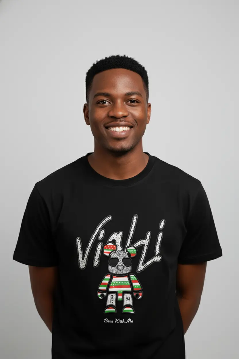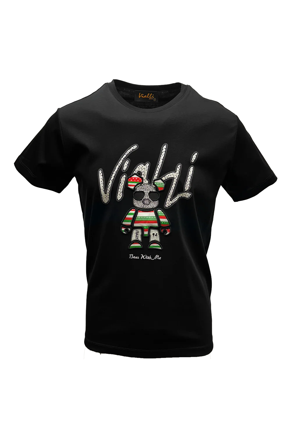 VialliA men’s black T-shirt made from premium cotton. It has a standard fit, a comfortable round neck, and a striking, textured Italian-themed teddy bear graphic on the chest.