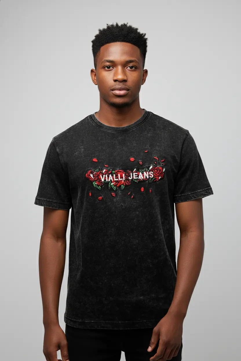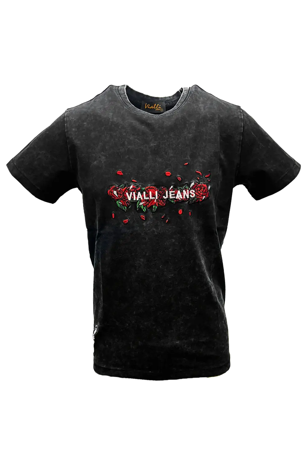 VialliMen’s stone-wash black T-shirt with a standard fit, made from soft, breathable cotton. Features a unique, embroidered design of red roses and the Vialli Jeans logo, plus a decorative revolver patch on the side.