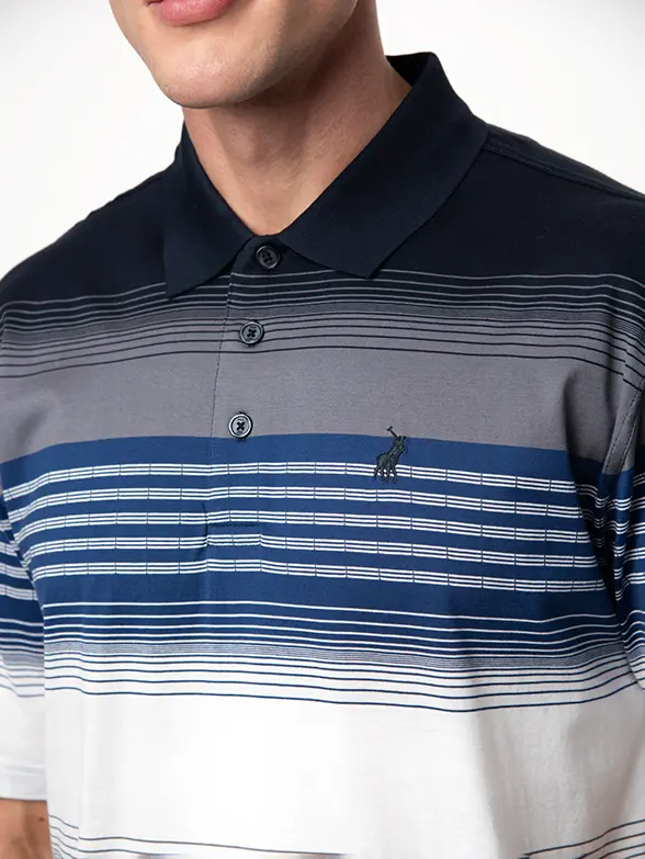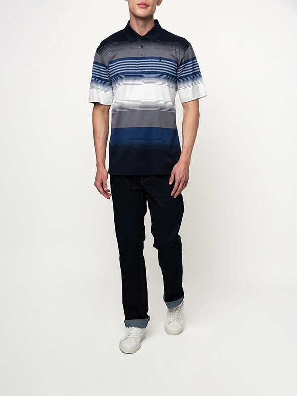 PoloNavy double mercerised golfer featuring a gradient stripe pattern and solid navy collar.