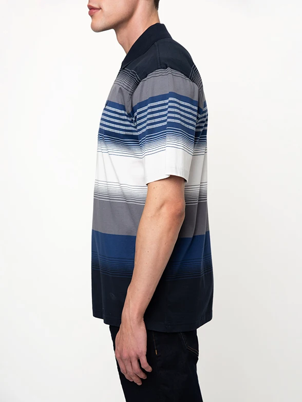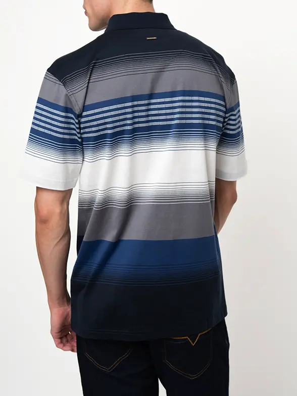 Navy double mercerised golfer featuring a gradient stripe pattern and solid navy collar.