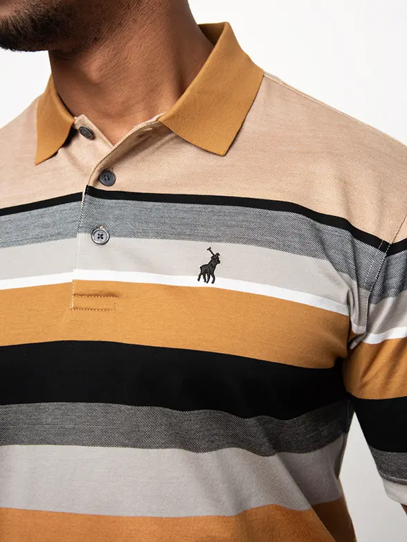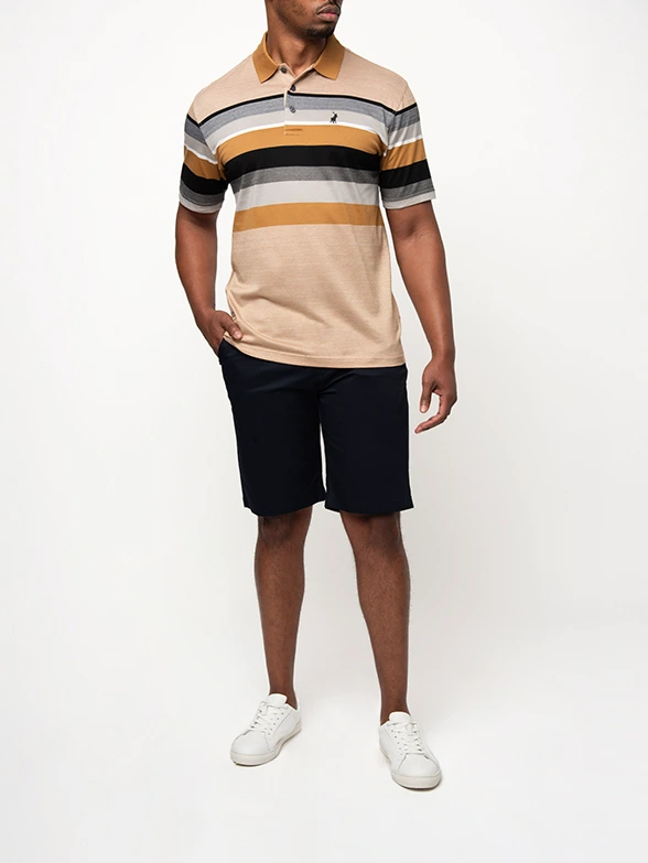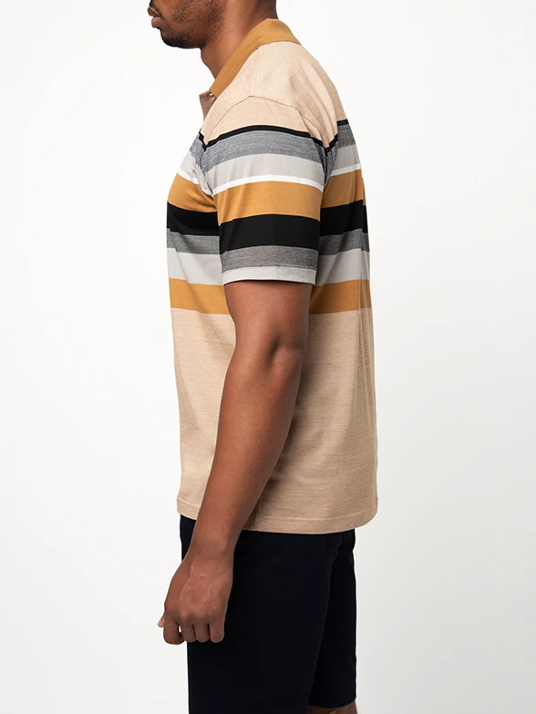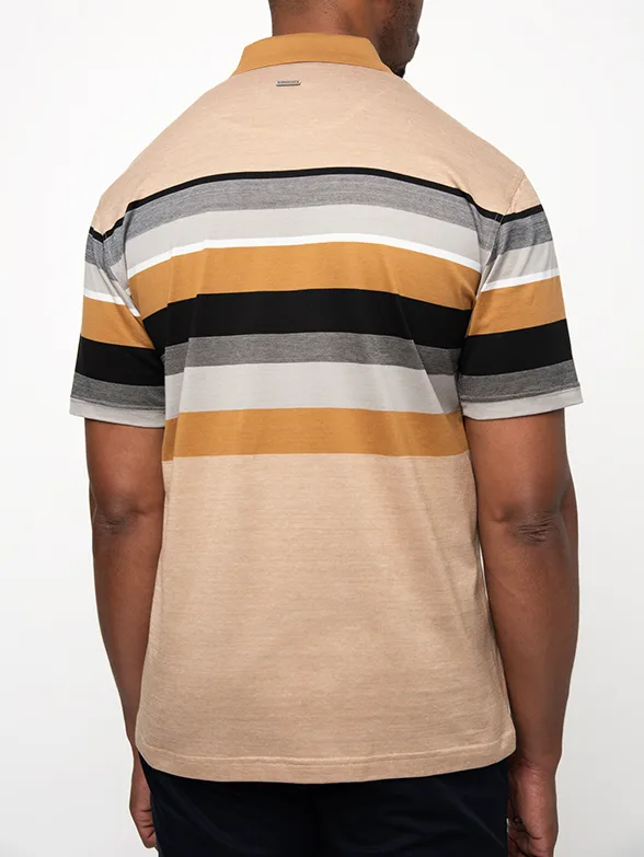 PoloCamel double mercerised golfer featuring a bold horizontal stripe pattern and solid camel collar.