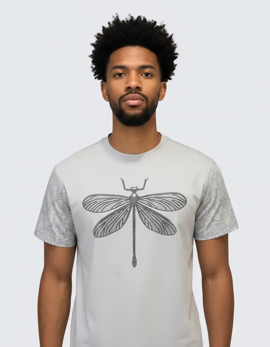 Pure PremiumLight gray men’s t-shirt features a studded dragonfly graphic on the chest and patterned sleeves. It has a crew neck and a regular fit.