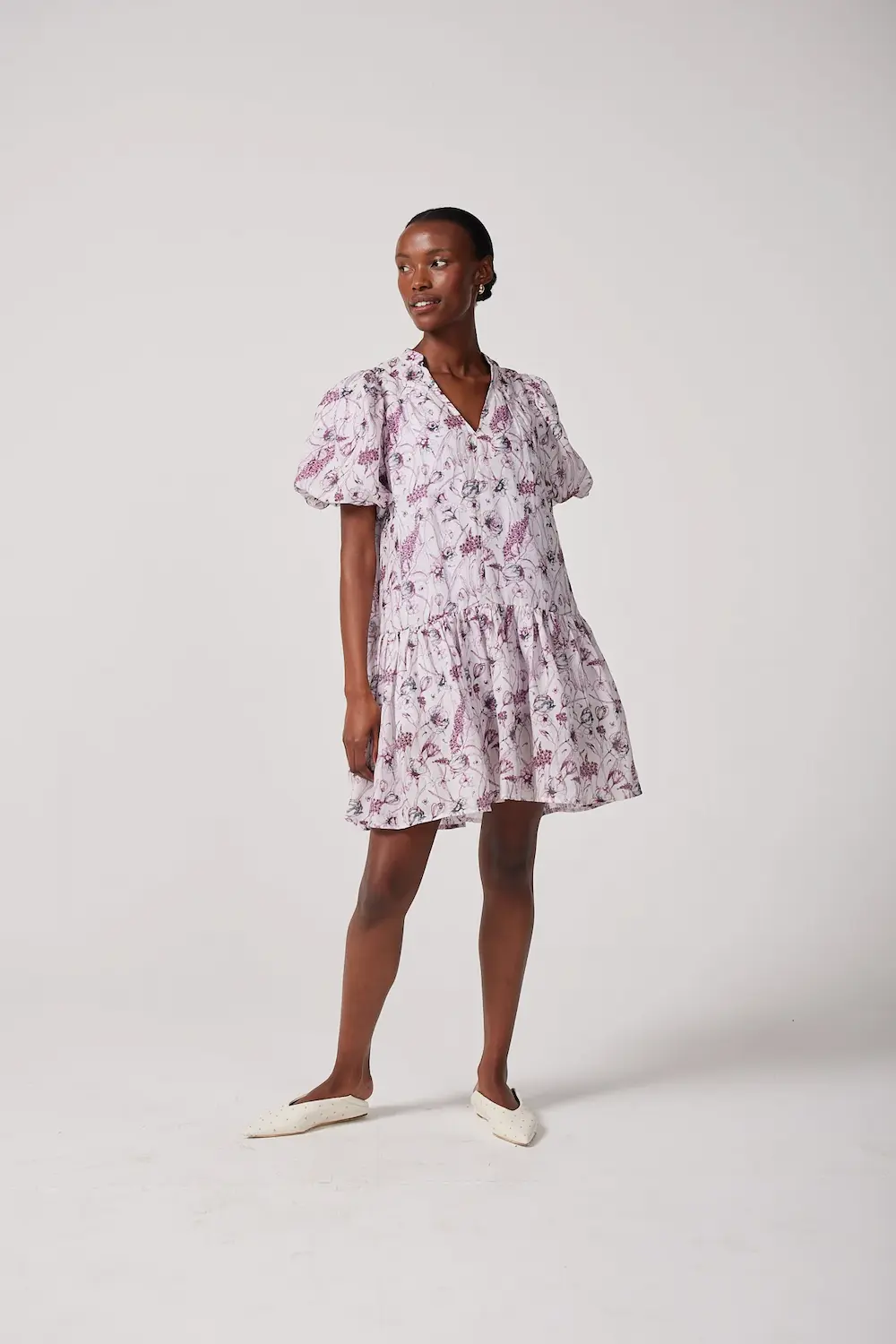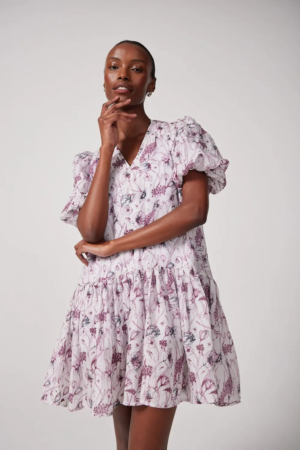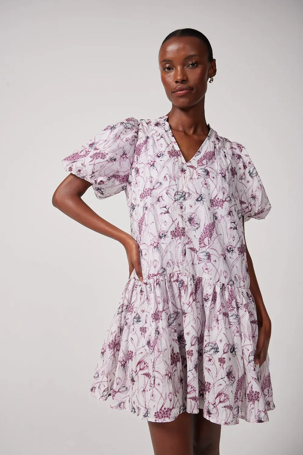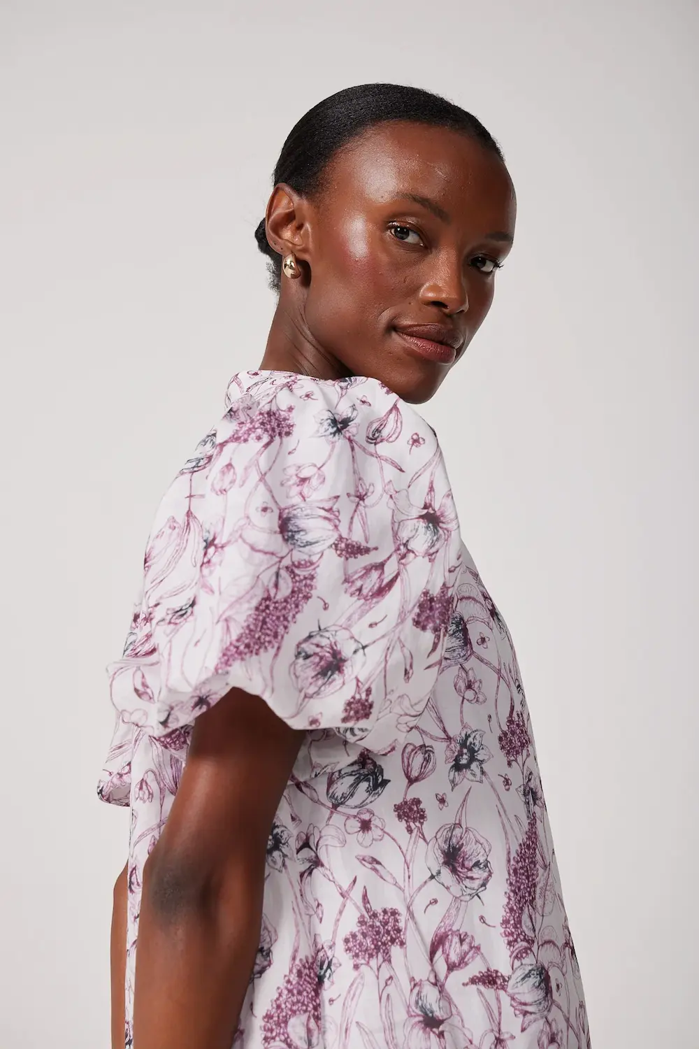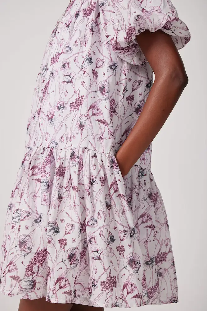 SmudjWhite mini dress made from premium sheer linen. You get an exclusive floral print, a comfortable lined interior, and practical side pockets.