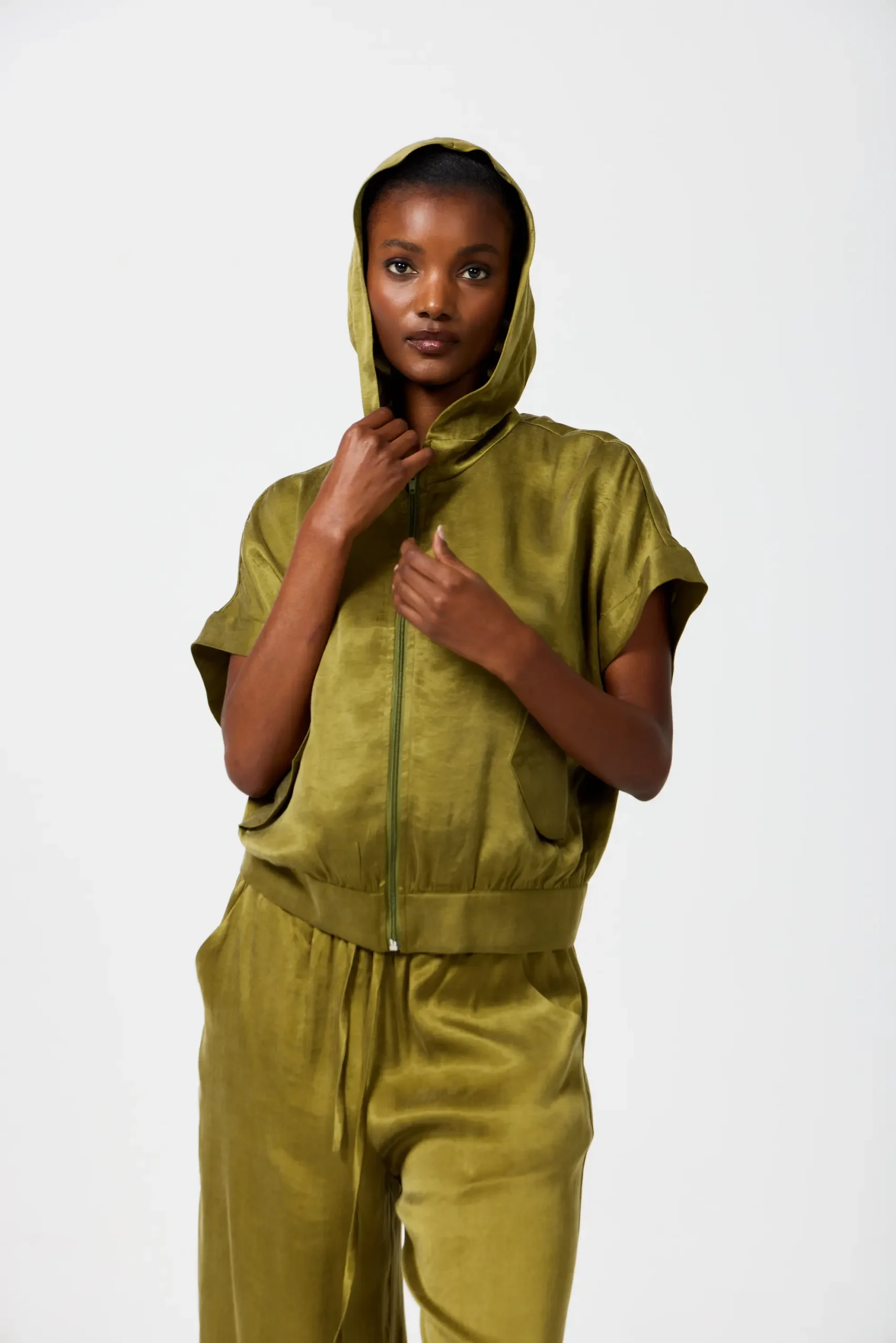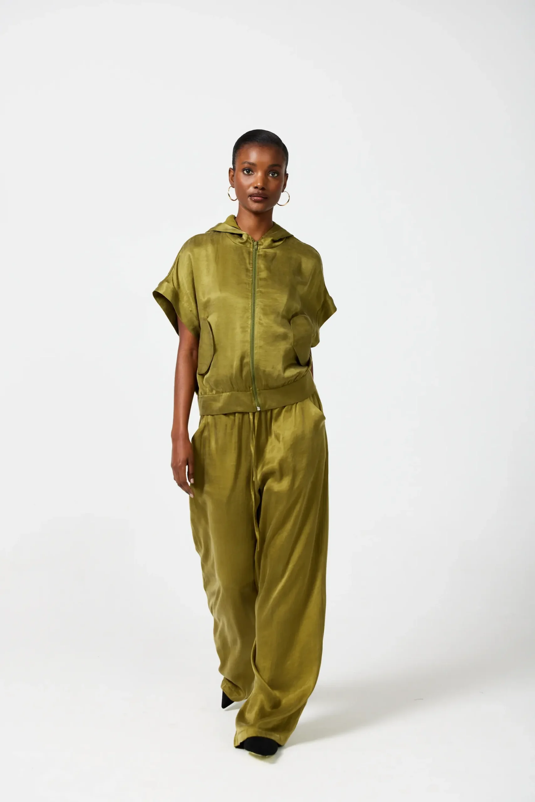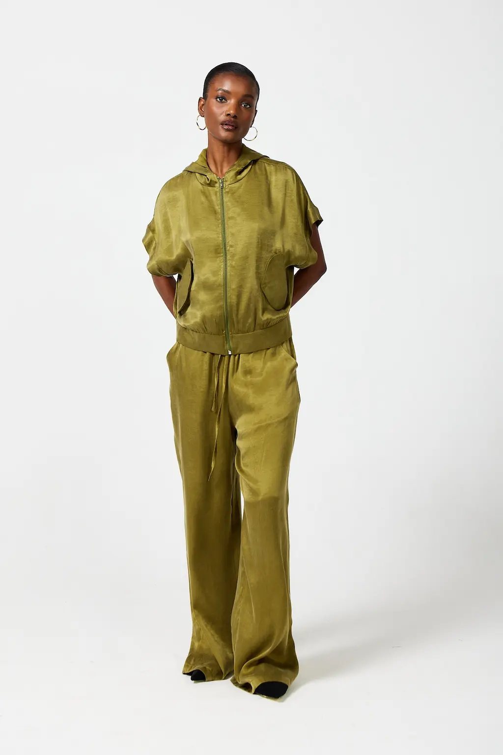 SmudjMatching set with a hooded anorak top and wide-leg pants in a satin fabric that feels cool on your skin. Available in Moss Green and Liquorice Black.