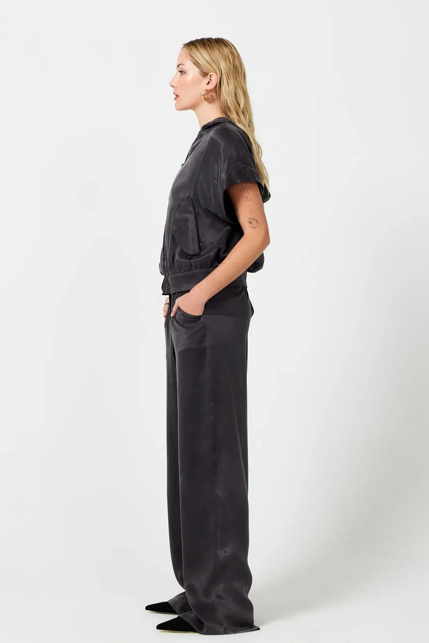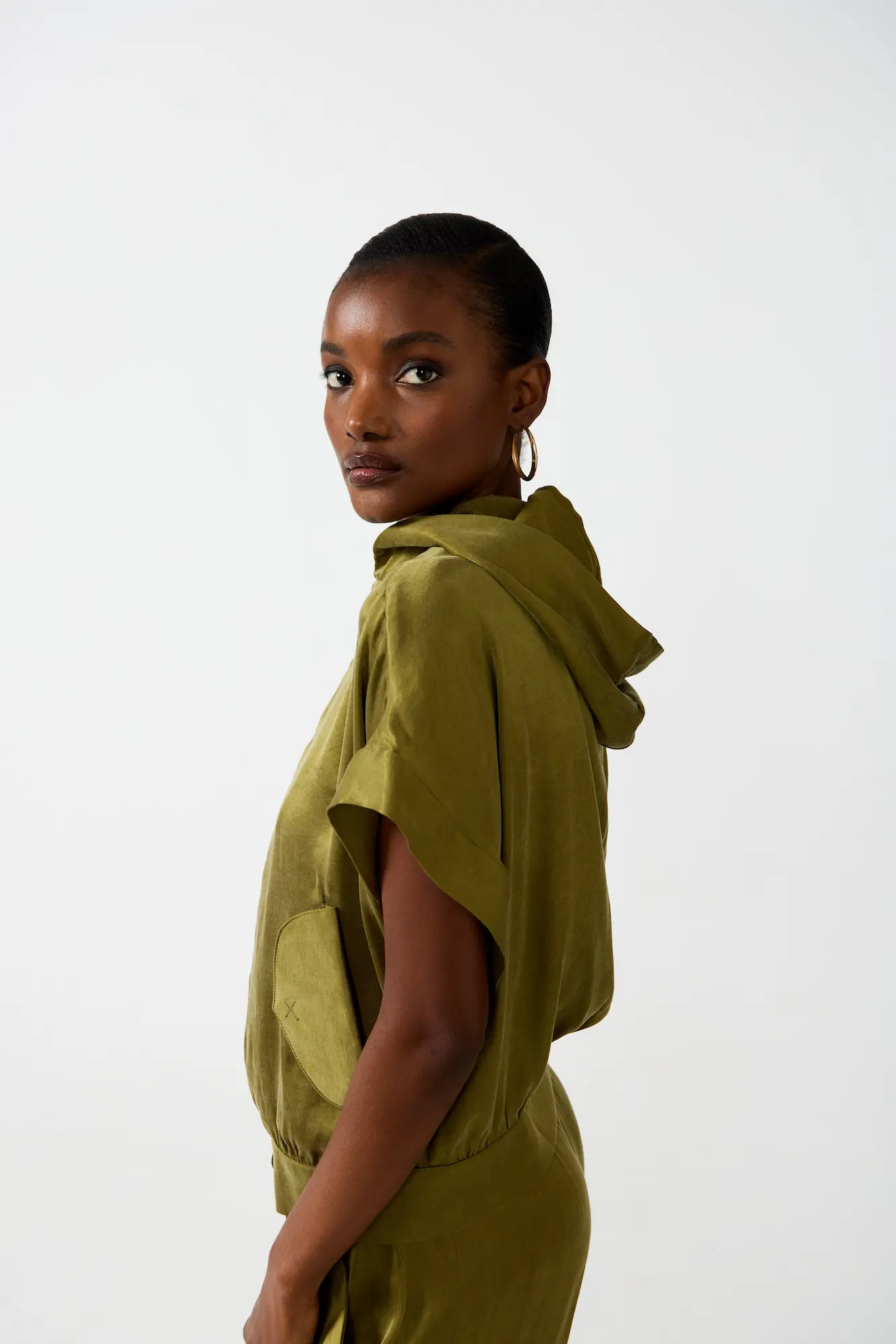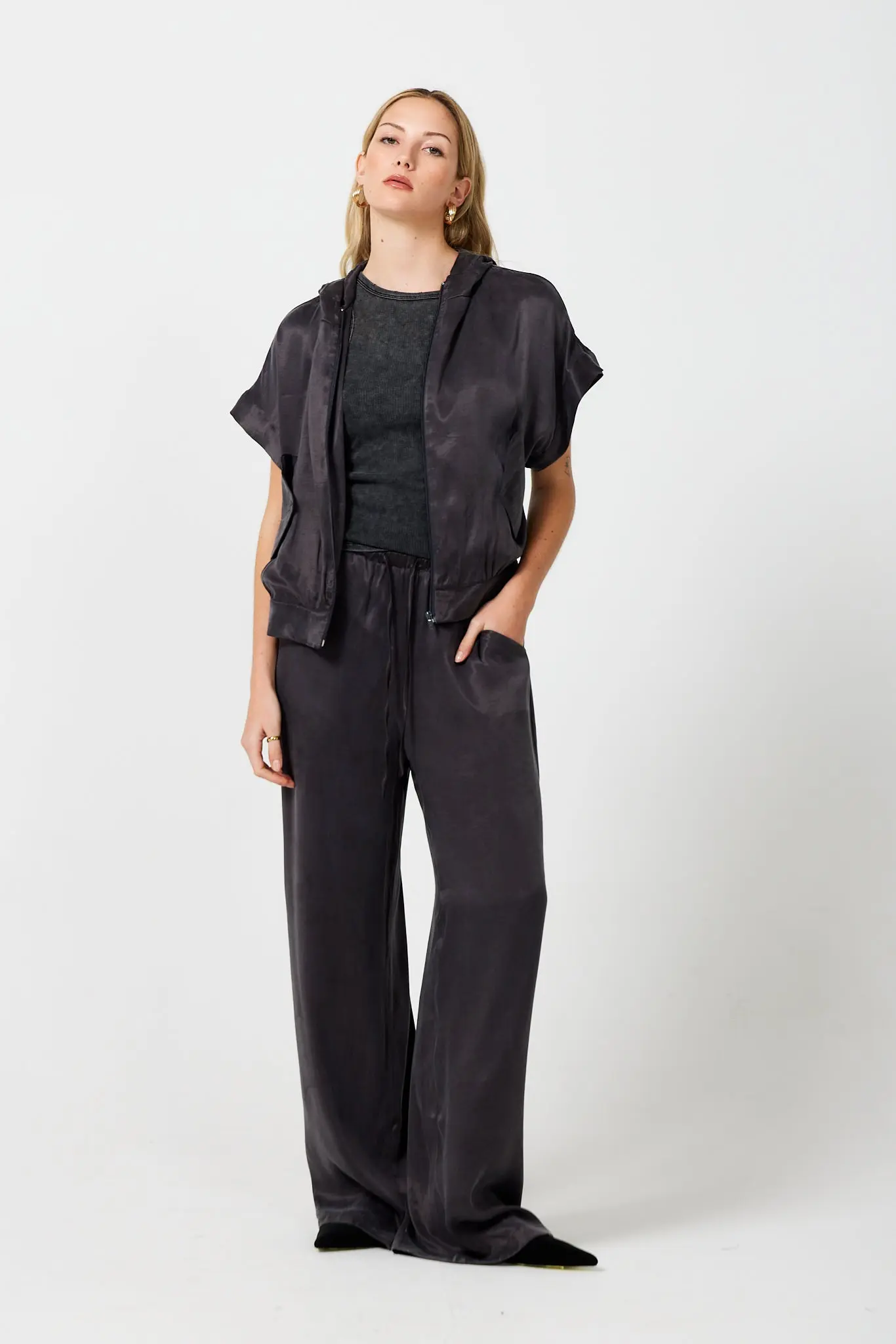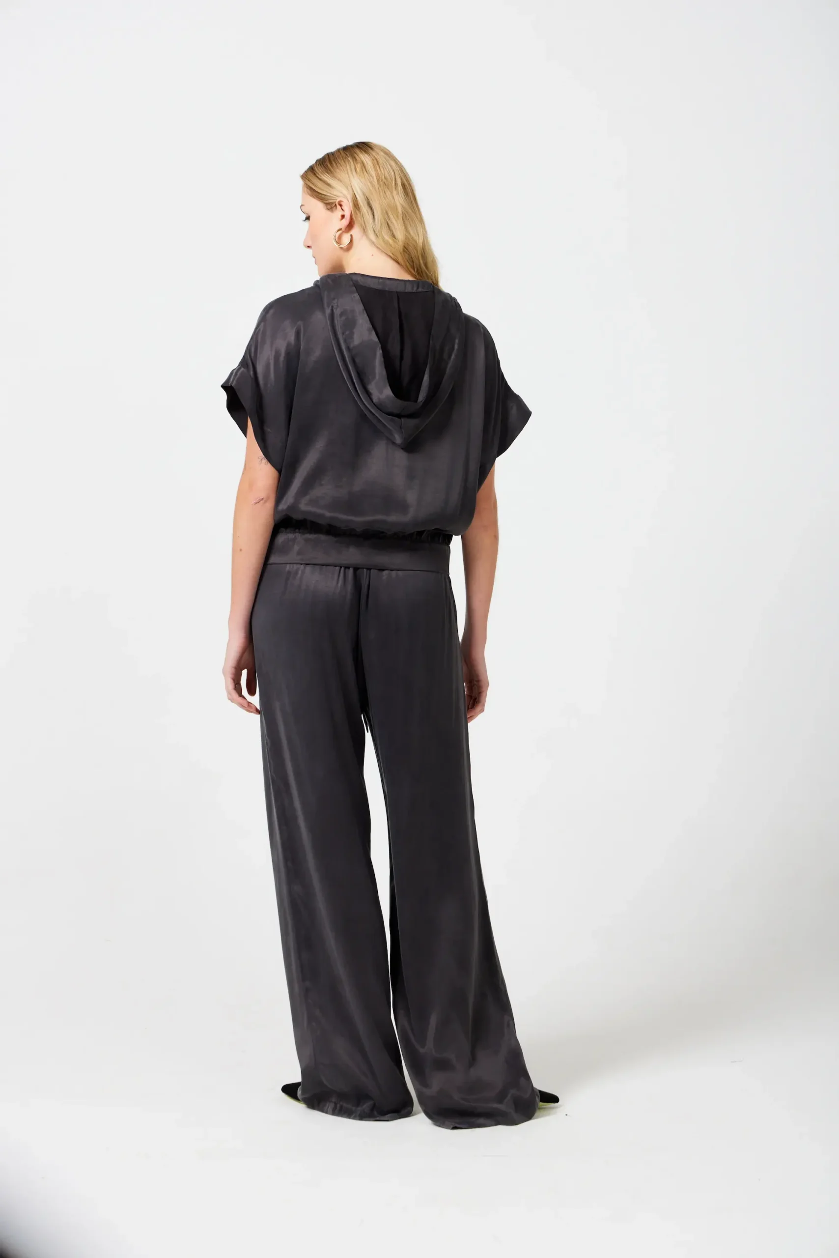 SmudjMatching set with a hooded anorak top and wide-leg pants in a satin fabric that feels cool on your skin. Available in Moss Green and Liquorice Black.